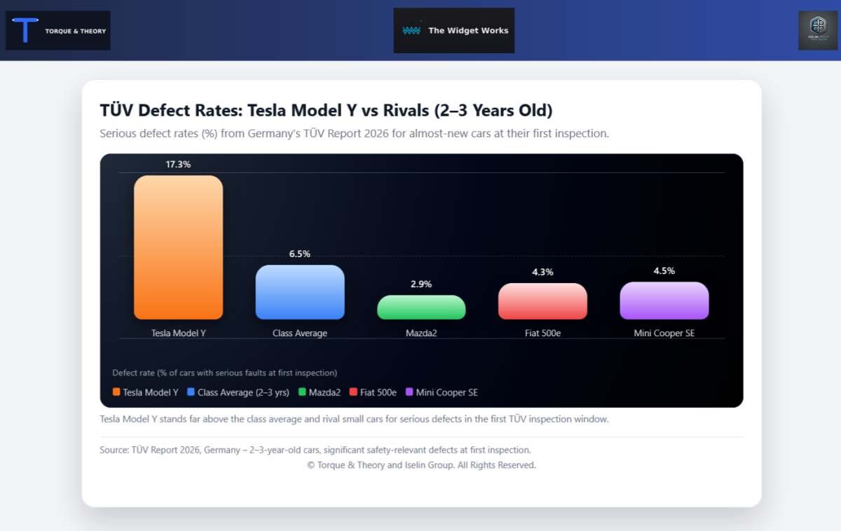 If you just bought a Tesla Model Y, you may want to sit down for this. In Germany’s new TÜV Report 2026, Tesla’s best-seller finishes dead last for reliability among two- to three-year-old cars. Not “below average.” Not “needs work.” Last place, with a serious defect rate of 17.3 % in its first inspection.