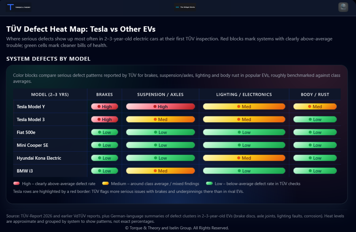 Here is the important part for you as a buyer: this is not about batteries or motors blowing up. TÜV and TÜV SÜD’s EV briefing both point at the same weak spots on the Model Y and Model 3. Axle suspension parts wear out early. Brake discs are worn or corroded. Lights are mis-aimed or faulty. These are basic safety items.