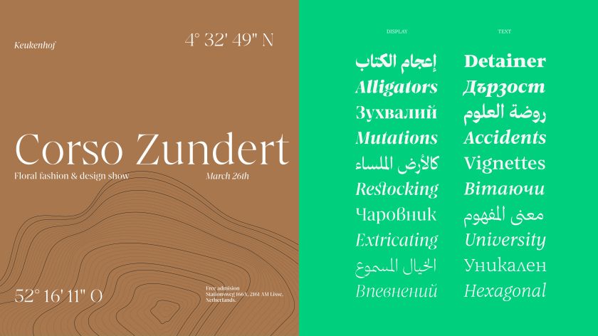 It grew from Jose Carratalá’s MA thesis at the University of Reading into something far more ambitious: shaped by Krista Radoeva on Cyrillic, Naïma Ben Ayed on Arabic and 29Letters founder Pascal Zoghbi overseeing the system. The Display version transforms practical text features into stylistic statements; the Text version offers warmth and classical proportion. The Latin details reward close attention; triangular terminals referencing stone-cut Roman capitals, an unconventional treatment of “g” that inverts Didone convention.