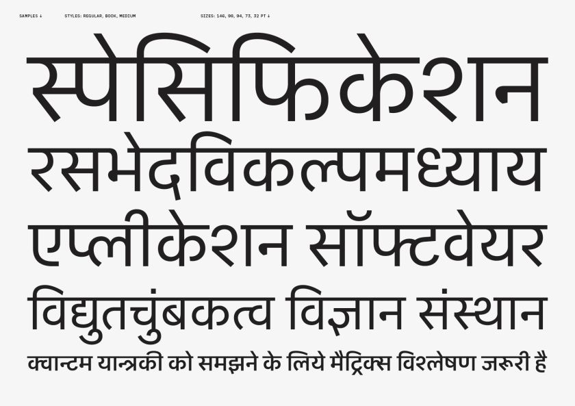 CoFo Sans Pro Devanagari is that relatively rare thing: a script extension clearly designed to be part of a family rather than bolted onto one. Contrast Foundry collaborated with Mumbai-based type designer Kimya Gandhi to create a companion that works seamlessly in multilingual Latin–Cyrillic–Devanagari settings. Open counters, softly rounded knots, and simplified matras give it warmth without compromising legibility across text and display sizes.