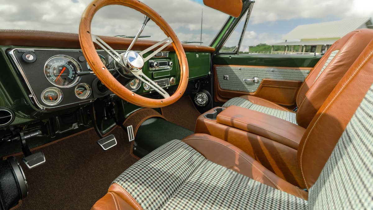 Since this is a bespoke restomod, ECD mixed in one-of-a-kind touches. The paint job is a period-correct two-tone of Chevy Dark Olive Poly and Frost White with a classic billboard stripe. While the interior’s been adorned with buffalo-vinyl seating, it’s paired with Pepita green houndstooth inlays. The climate control, audio system, and digital gauges have all been given a modern touch.