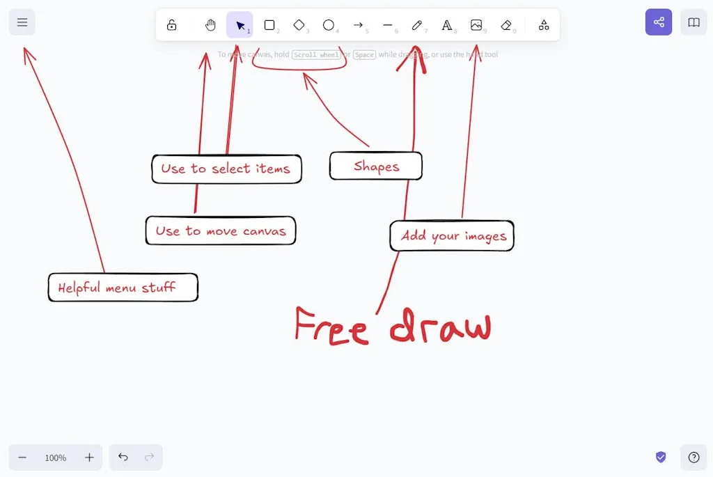 ✅ To start using Excalidraw, just pick one of the drawing tools at the top of the screen, then click and drag on the canvas to insert it.
