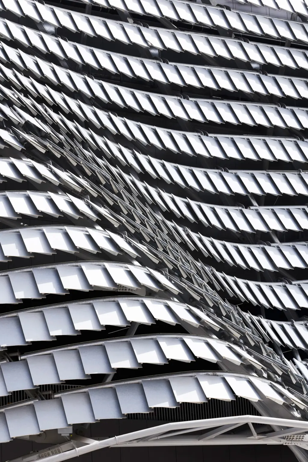That connection to the outside extends throughout the building. Its facade, made of 8,600 ceramic scales, was carefully configured to block the intensity of the sun while still allowing coastal breezes to enter the building. This partially cools the building, cutting down on its energy use. A rooftop solar array also reduces its energy demands.