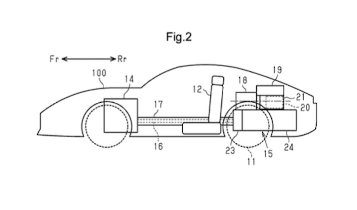 Instead of new motors or batteries, Toyota’s patent is all about how the hybrid parts are laid out. The engine stays up front. A prop shaft runs down the middle, linking to a rear transaxle that packs in the electric motor, gears, and differential.