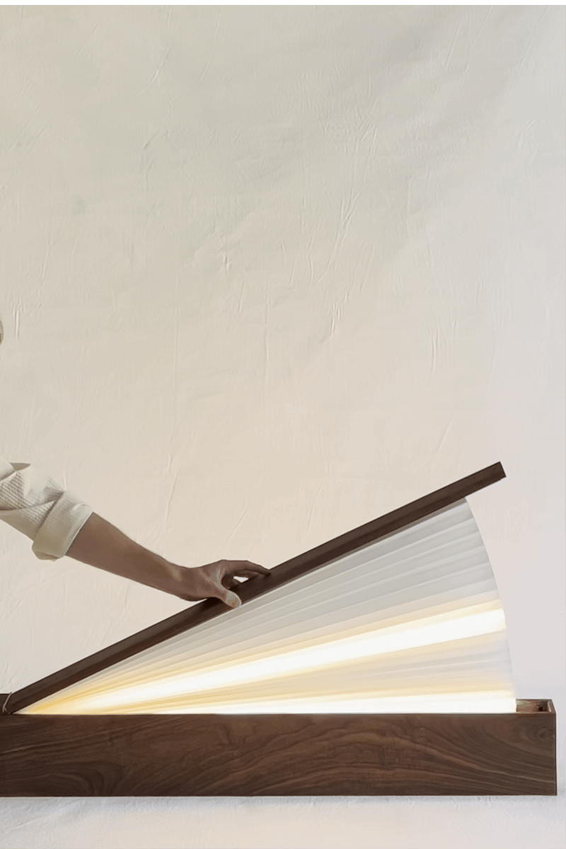 To do so, Wolfe turned to materials that embody both strength and lightness. Made by hand from reinforced Japanese paper and walnut, the Sail Light balances delicacy with structure. When closed, it appears as nothing more than a refined walnut box – understated and serene. But as the lid lifts, the pleated sail unfurls, revealing a sculptural light that softly transforms the space around it.