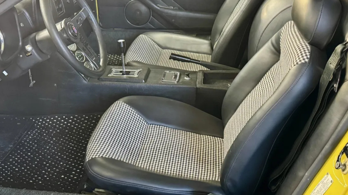 Inside, the bucket seats received replacement bolsters and were reupholstered in black vinyl with houndstooth cloth inserts. Under the current ownership, the car also gained a Ferrero steering wheel, an aftermarket stereo and speakers, a new headliner, and retrimmed side panels.