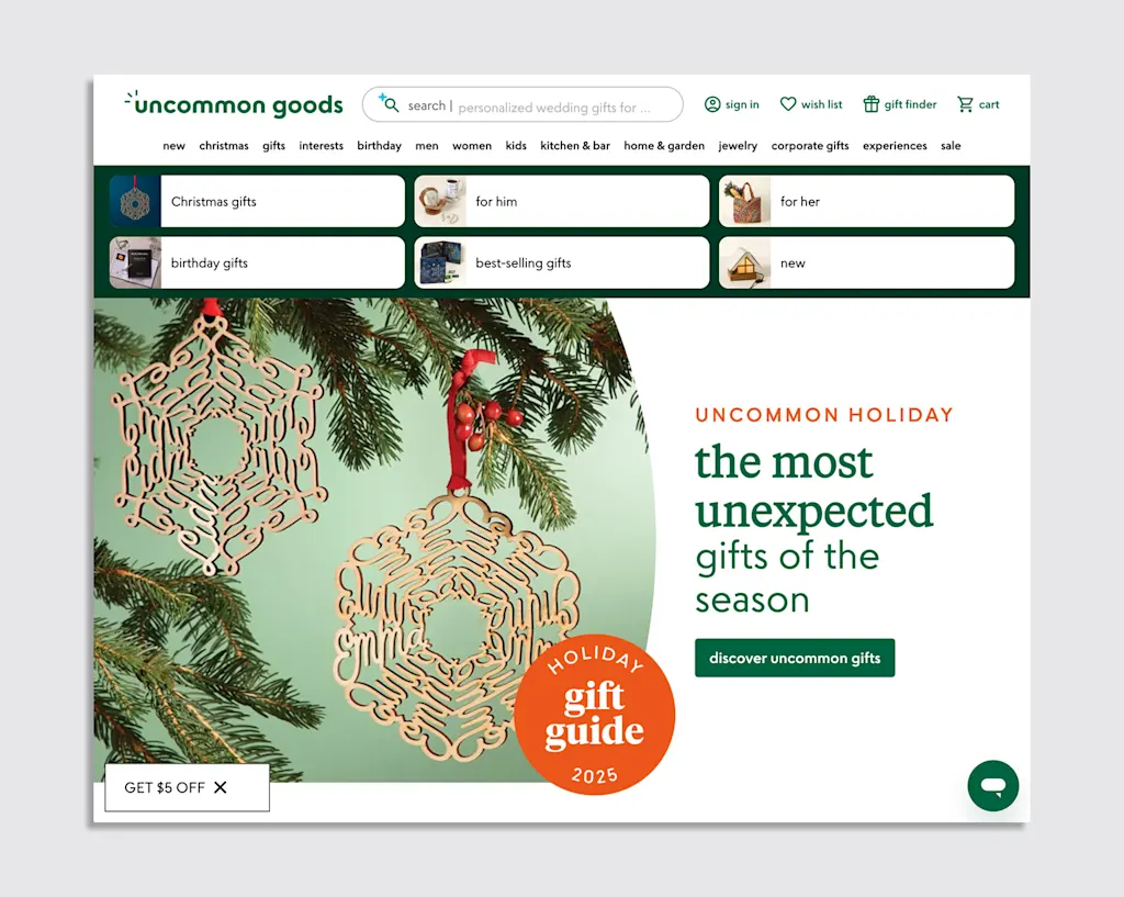 The Uncommon Goods site procures roughly 80% of its products through its buying team, while an in-house product development team fills in the remaining 20%, largely through partnerships with a roster of product makers it has worked with before.