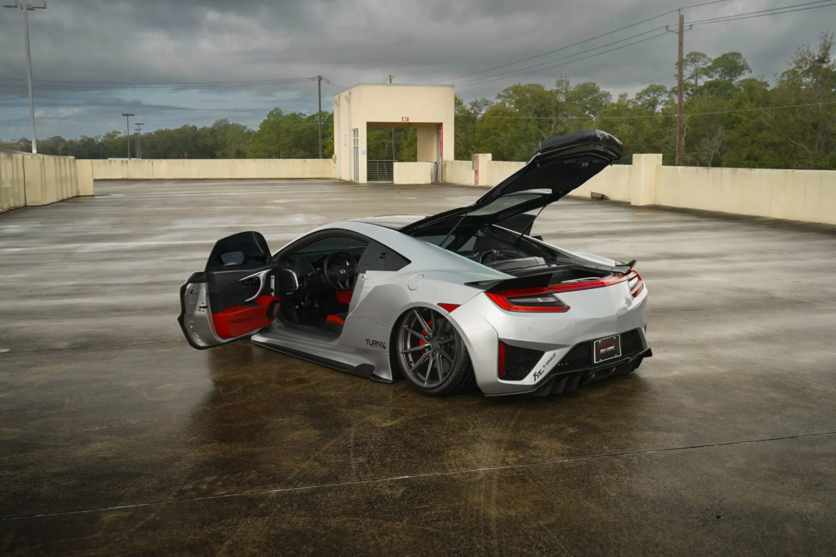 The list of modifications is quite long, but it includes a Fi exhaust system, 20- and 21-inch Vossen multi-spoke wheels, and an Air Lift Performance suspension. The exterior looks have been modded with Jewel Eye LED headlights, carbon-ceramic brakes, an ELS sound system, and carbon-fiber engine bay trim. The body is finished in Silver, and the body kit from AimGain gives this NSX a wider stance.