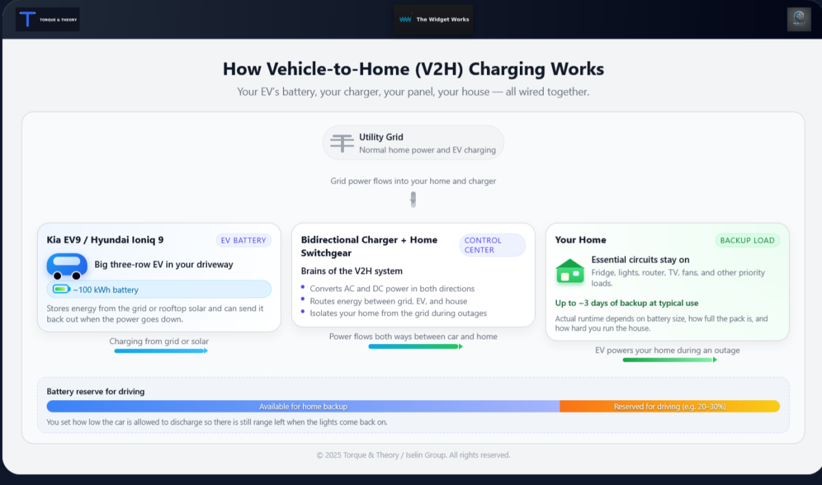 The street is dark, your neighbors’ houses are out, and your kids are still watching Netflix like nothing happened. The difference is sitting in your driveway. Vehicle-to-home charging turns a Kia EV9 or Hyundai Ioniq 9 into a giant backup battery for your house, not just a way to skip gas stations.